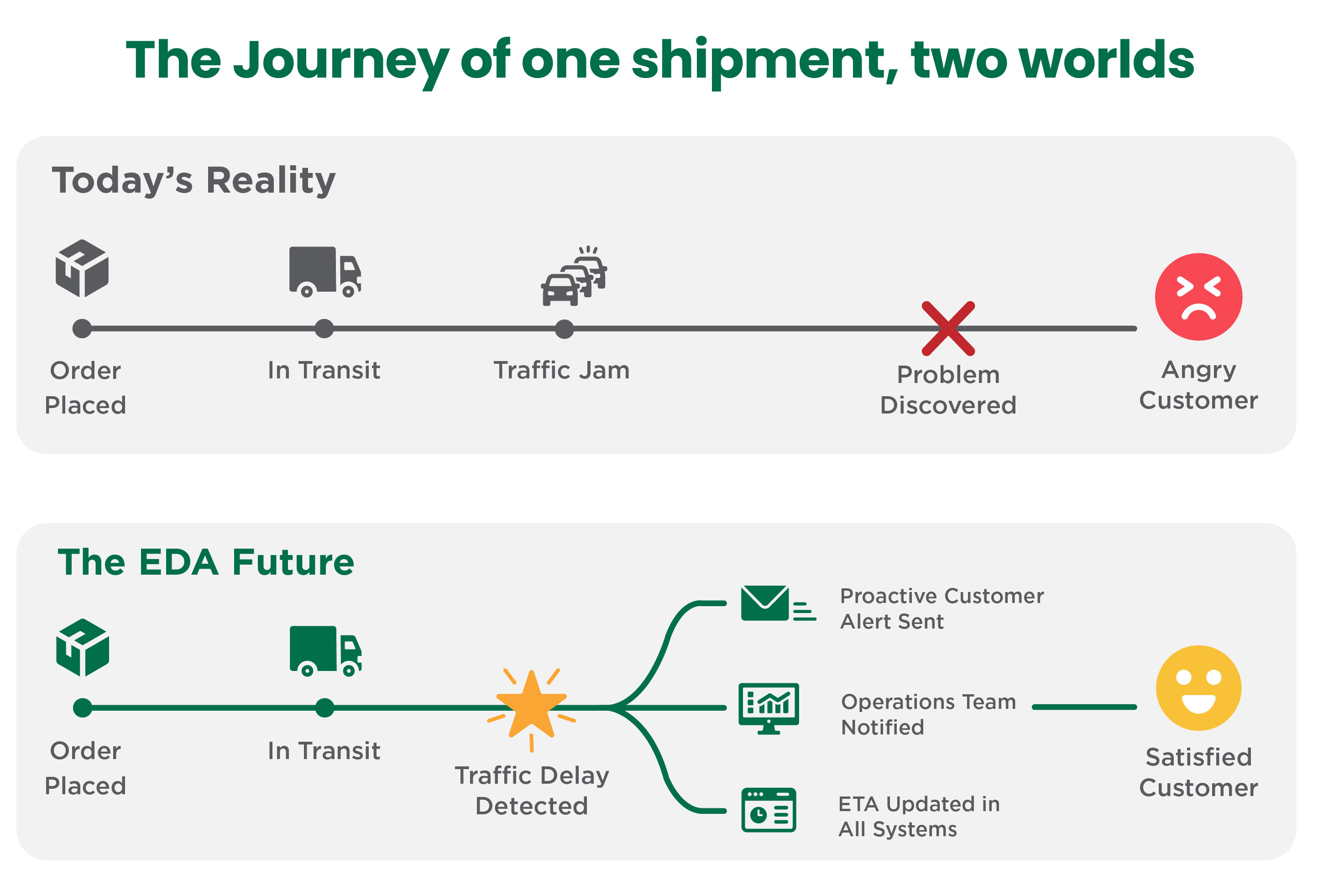 EDA converts logistics from system-driven workflows to event-triggered, real-time decisioning.